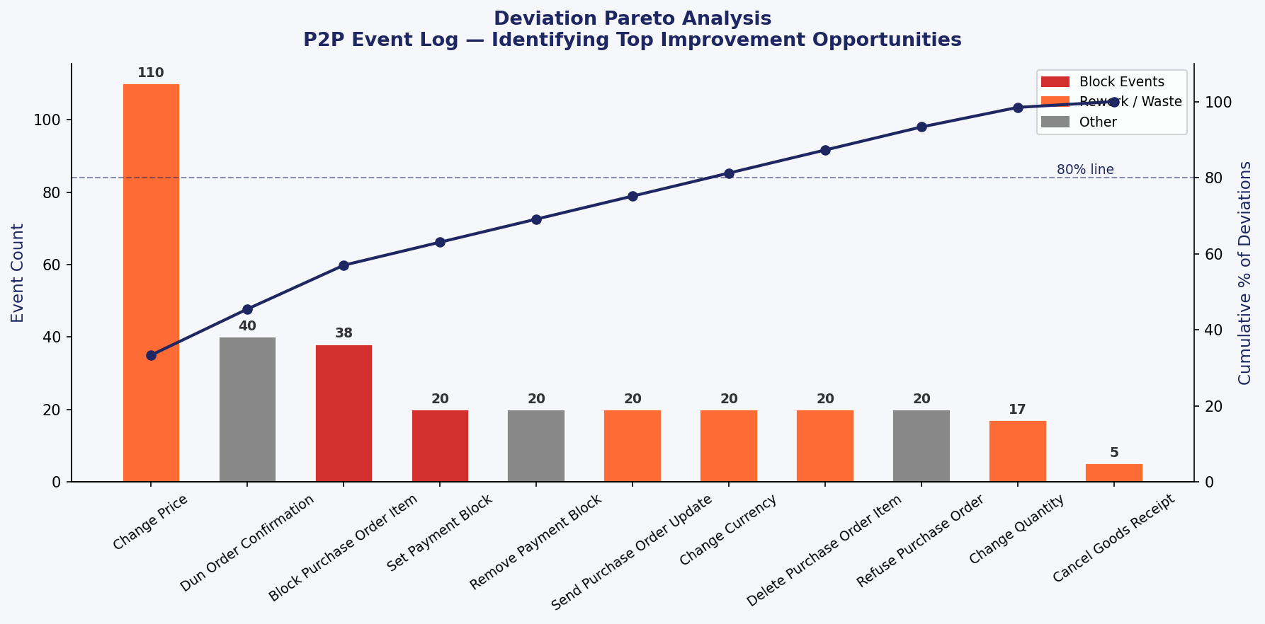 | Activity | Event Count | Business Impact | |———-|————-|—————–| | Change Price | 110 | Price mismatches → manual rework | | Block Purchase Order Item | 38 | PO delays → extended cycle time | | Set Payment Block | 20 | Invoice holds → delayed clearance | | Change Currency | 20 | Currency mismatches → compliance risk | | Delete Purchase Order Item | 20 | Procurement waste |